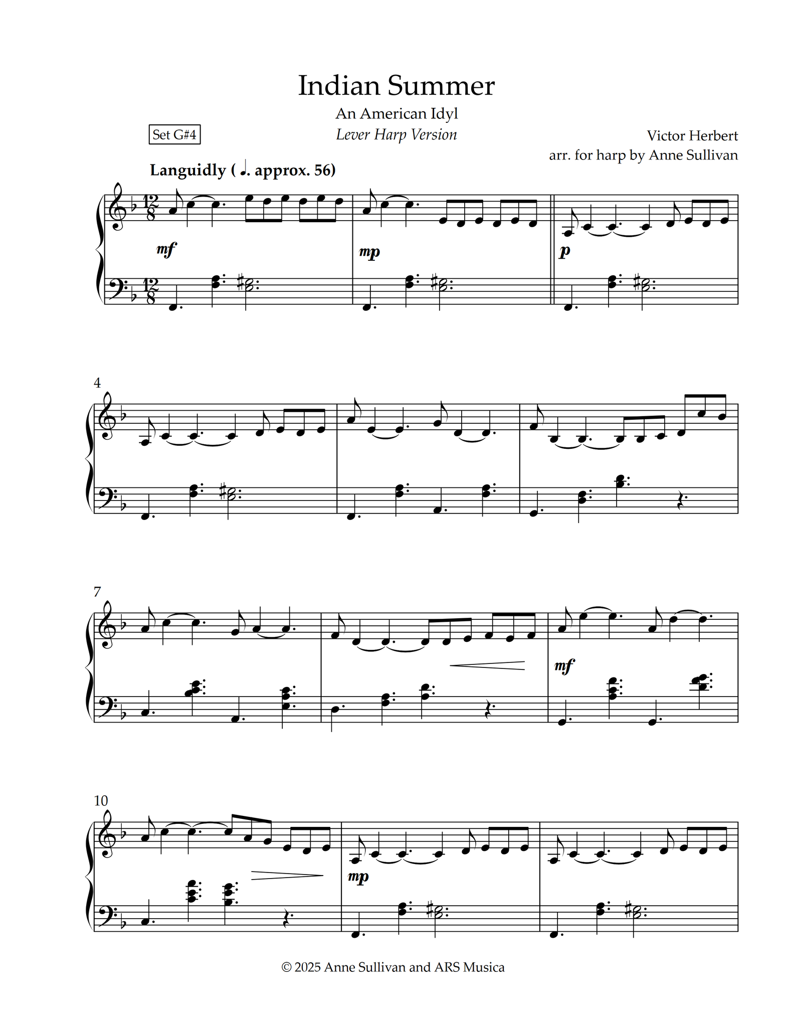 The PDF includes two separate arrangements for lever and pedal harp, each with only a few accidental changes. Each arrangement is in F Major and is three pages long.