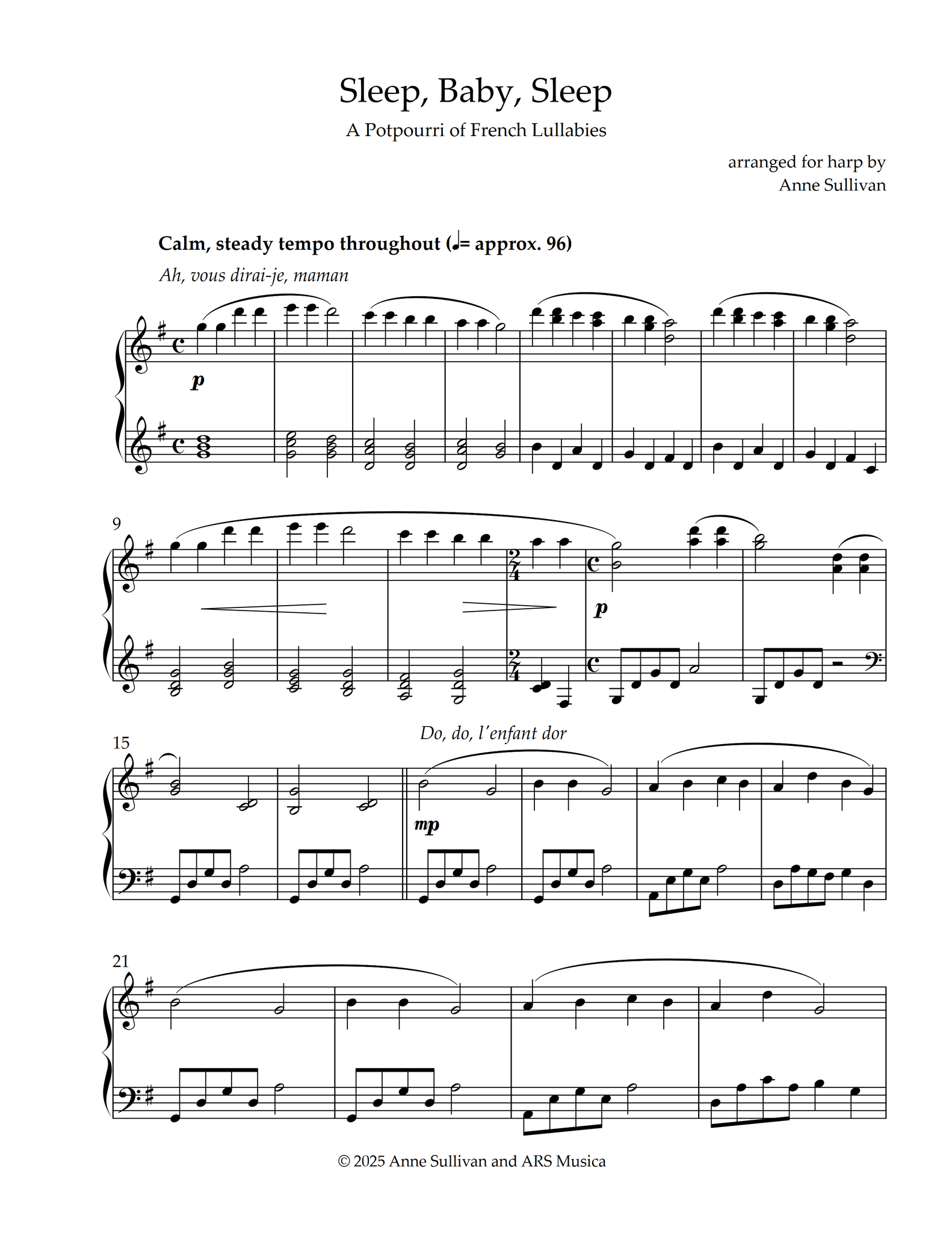 This soothing medley of traditional French and French Canadian lullabies is guaranteed to relax both listener and harpist. The pieces included are: