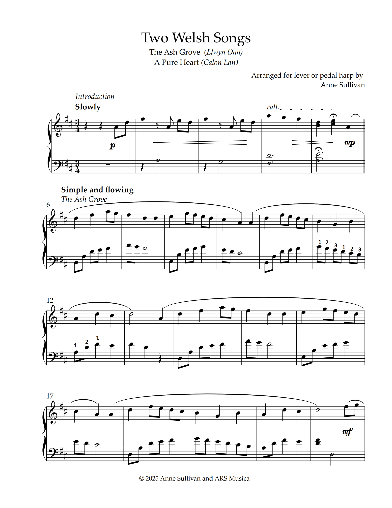 The familiar Welsh tune of “The Ash Grove” has been used with numerous sets of lyrics, including the hymn, “Let All Things Now Living.” "Calon Lân," meaning “A Pure Heart,” is a Welsh hymn, with lyrics written in the 1890s by Daniel James, known also by the bardic name, Gwyrosydd. This arrangement is suitable at any time but is especially appropriate at Thanksgiving. The piece is 3 and a half pages long, with no lever or pedal changes. Partial lyrics for Calon Lan are also included.